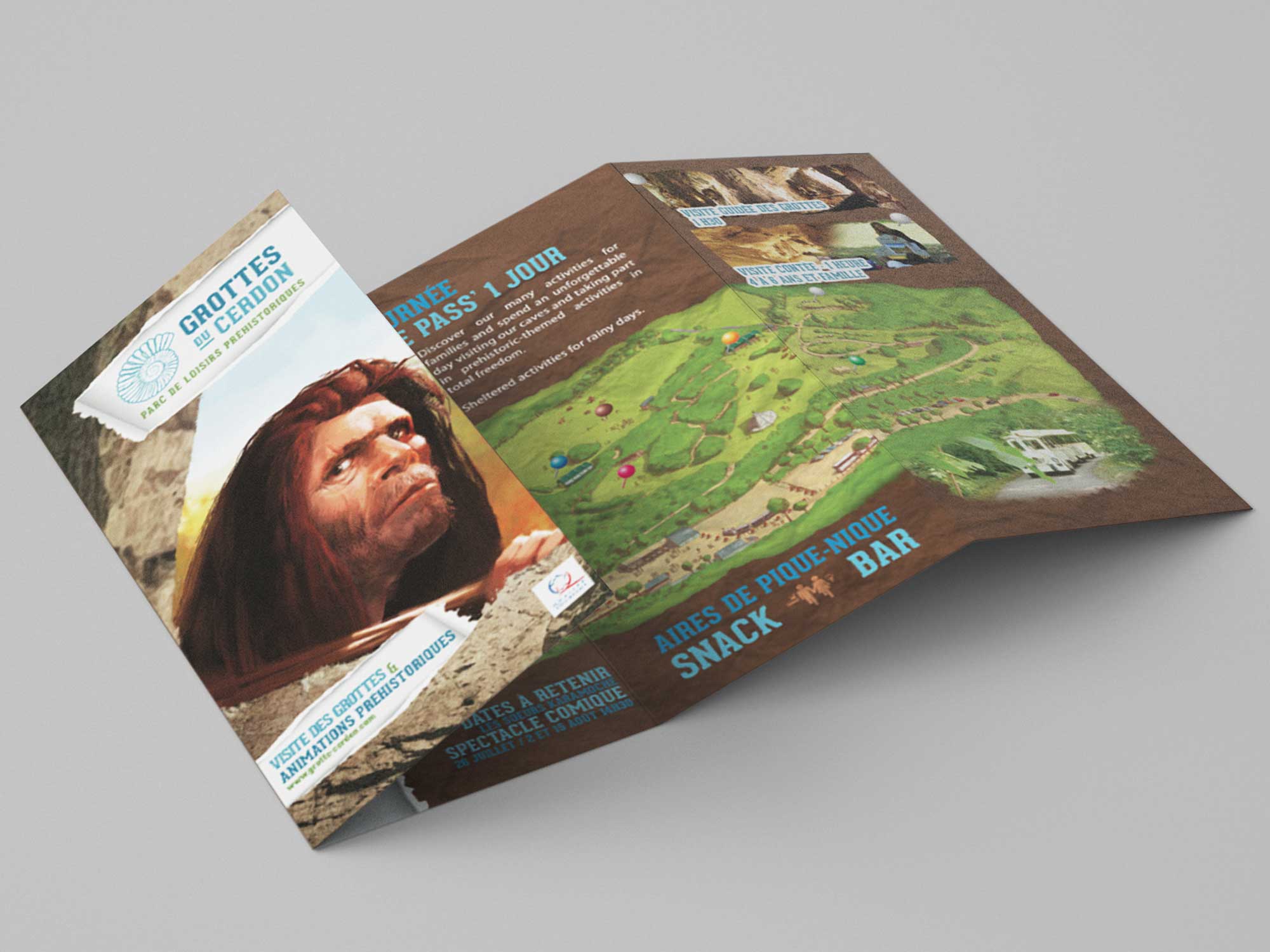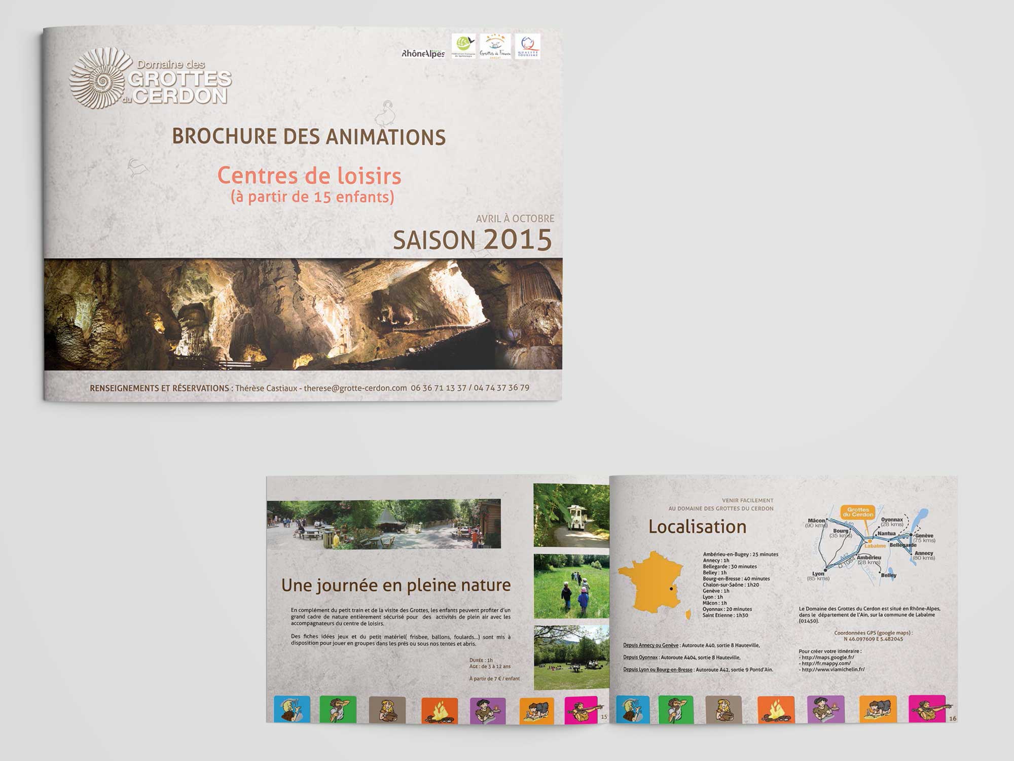 Fort de cette nouvelle identité, et toujours dans une démarche de refonte de la communication, on m’a chargé de créer et décliner les dépliants des Grottes du Cerdon. Un dépliant pour les familles avec enfants et 4 autres destinés aux écoles ( du CP aux collèges ).